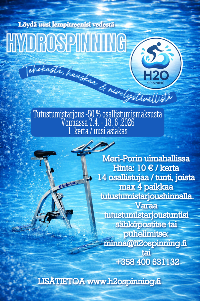 Tarjoamme uusille asiakkaille mahdollisuuden kokeilla hydrospinningiä -50 % alennuksella 7.4.-18.6.2026 välisenä aikana. Tutustumiskerran hinnaksi jää ainoastaan 5 euroa. Varaa paikkasi pian! Tutustumistarjouspaikkoja on vain 4 per tunti. Tutustumistarjoustunnille ilmoittaudutaan poikkeuksellisesti sähköpostitse tai puhelimitse, jotta voidaan sopia maksutavasta ja saat tarvittavat osallistumisohjeet. Nähdään altaalla!