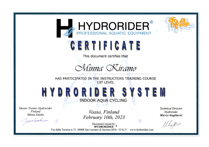 Olen Minna Kiramo, ohjaan hydrospinning-tunteja Meri-Porin uimahallissa – useimmiten altaassa yhdessä osallistujien kanssa polkien. Olen suorittanut Hydrospinning Taso 1 -ohjaajakoulutuksen Vaasassa helmikuussa 2023, ennen ohjaajaksi ryhtymistä harrastin lajia yli kuuden vuoden ajan. Ohjaaminen kumpuaa edelleen puhtaasti rakkaudesta lajiin – haluan itse harrastaa lajia ja samalla varmistaa, että hydrospinning pysyy osana Porin liikuntatarjontaa.